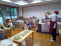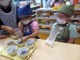 ゆり組による10月度のクッキングでは、「ぶんぶんおにぎり」を作りました。秋はお米の収穫時期なので、最初は「おむすびさんちのたうえのひ」の絵本を見ながら、田植えの様子や、普段食べているお米がどのようにしてできあがるのかをみんなで考えました。その後1人1つ、袋に入ったお米をもらいおにぎりづくりがスタート!今回はしらす、おかか、ゆかり、あおのり、ごましおの5種類があり、その中から好きな具材を自分で選び袋の中に入れていきました。「みて〜全部入れた!」、「おかかとあおのりにした!」等と言いながら、白いお米が色とりどりになりました。最後に袋の上部分を持って振るとおにぎりの完成です!自分で作ったおにぎりは格別でみんなあっという間に完食でした。
