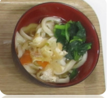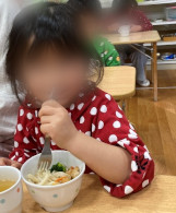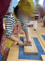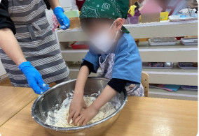 ゆり組による2月の食育活動では、うどんを一から作りました。さらさらとした感触の小麦粉があのうどんになるなんて、信じられない様子の子どもたちでしたが、塩水を入れてこねていくと固くまとまってきたので、その変化を楽しんでいました。次にホールに移動し、足で踏みつけさらにコシを出します。みんな裸足になってスタンバイし、ビニール袋に入れた生地の上で足踏みしたりジャンプしたり。力強く踏みつける年長さんが良いお手本となり、年中さんも年少さんも一生懸命踏んでくれました。良い生地が出来上がり、少し寝かせてから年長さんが切り分けてくれました。包丁を使う時はみんな真剣な顔で、上手に切っていましたよ!できあがったうどんは給食室で茹でて、おやつで提供しました。ほうれん草、油揚げ、ねぎ、にんじんが入っていて他クラスのお友だちも一緒にみんなで頂きました。しっかり踏みしめたうどんは、「モチモチしてておいしい」と大人気!たくさんあったうどんもあっという間になくなり、みんな大満足でした!