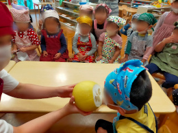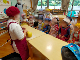 味噌の材料(大豆と米麹)の観察、試食を行い、味噌がどのようにできるのか絵本を読んで説明しました。子どもたちには、ゆでた大豆を潰し、米麹、塩を混ぜた味噌玉を作って樽に投げ込む作業を行ってもらいました。力いっぱい投げる子や優しく入れる子等様々でみんなで大盛り上がりでした。当日の給食には大豆を使ったメニューで鶏の味噌焼き、小松菜の納豆和え、おやつにはマカロニきな粉を提供し、食育で学んだ内容が日々の生活に繋がっていることを意識してもらえるようにしました。