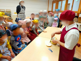 今年度初めてのクッキングのため、お約束(身だしなみや衛生について)を理解してもらうこと、楽しんでクッキングをしてもらうことを目的に実施しました。いちごジャムときなこペーストを用意し食パンに塗って食べました。みんな美味しい、楽しかった!という声がたくさん聞こえました。