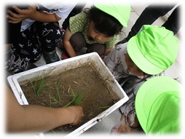 経験のある3-5歳児さんは、すっかり慣れた手つきで苗を植えていました。2歳児さんは、泥や水の感触を楽しんでいました。