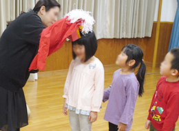 こどもたちは、「もちつき」の歌を歌い、鏡開や年神様(としがみさま)のお話を聞きました。そして、「もちつき」が日本古来からの伝統行事で「今年一年が幸せでありますように」という願いを込めて行われることを知って、より一層関心が高くなったようです。