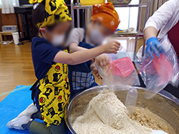 次に茹でた大豆を袋に入れてつぶします。粒々の感触からだんだん柔らかくなる様子が面白く、どんどん調子が上がる子どもたち。「みてー、こんなにつぶれたよ!」などとお友だちや先生たちにアピールしていました。その後、保育士が「だいず」「みそができるまで」の絵本の読み聞かせを行い、みそに関する知識を更に深めた子どもたちでした。ホールに移動した後、つぶした大豆を集め、タライに入れ、そこに米麹と塩を入れて混ぜます。その後、全身の体重をかけて足で力いっぱい踏みしめました。