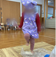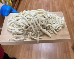 ゆり組による2月の食育活動では、うどんを一から作りました。さらさらとした感触の小麦粉があのうどんになるなんて、信じられない様子の子どもたちでしたが、塩水を入れてこねていくと固くまとまってきたので、その変化を楽しんでいました。次にホールに移動し、足で踏みつけさらにコシを出します。みんな裸足になってスタンバイし、ビニール袋に入れた生地の上で足踏みしたりジャンプしたり。力強く踏みつける年長さんが良いお手本となり、年中さんも年少さんも一生懸命踏んでくれました。良い生地が出来上がり、少し寝かせてから年長さんが切り分けてくれました。包丁を使う時はみんな真剣な顔で、上手に切っていましたよ!できあがったうどんは給食室で茹でて、おやつで提供しました。ほうれん草、油揚げ、ねぎ、にんじんが入っていて他クラスのお友だちも一緒にみんなで頂きました。しっかり踏みしめたうどんは、「モチモチしてておいしい」と大人気!たくさんあったうどんもあっという間になくなり、みんな大満足でした!