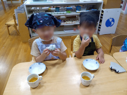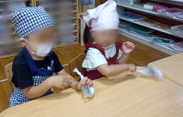 保育園生活に慣れてきて登園時は泣かずに登園したり、午睡も一定時間入眠できるようになってきました。モンテッソーリの活動では手先を使った活動を好んで取り組む姿が多く見られます。他にも玉ねぎの皮むきなど給食のお手伝いもしている子どもたちです。プール活動では、水を怖がることなくみんなプールの中に入って水遊びを楽しめています。